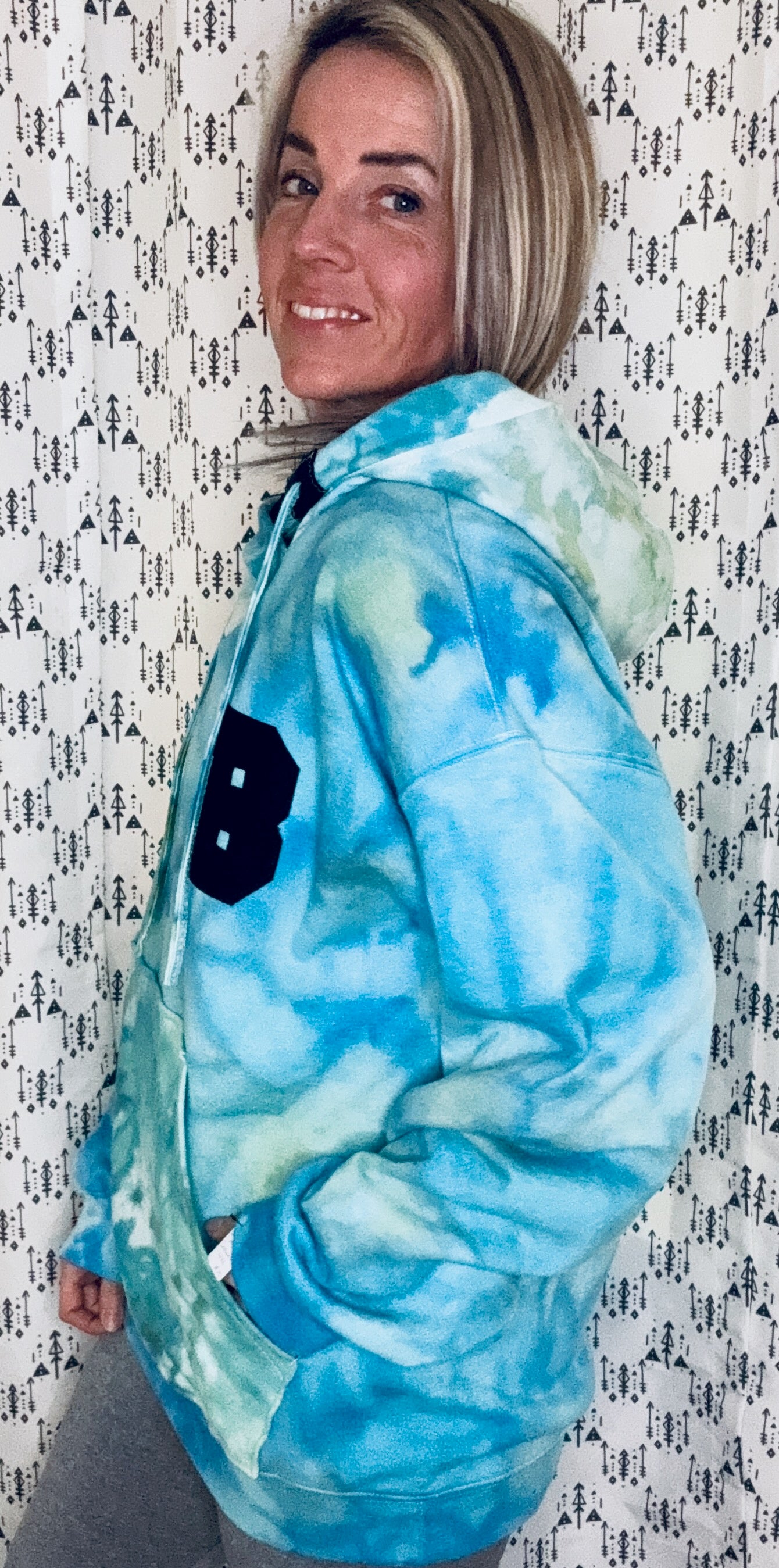Custom ice the dyed sweat shirt body with matching pocket and hood. Black color-blocking in sleeves. Buffalo sewn appliqué' on front. Shades of blue, aqua, and teals.
