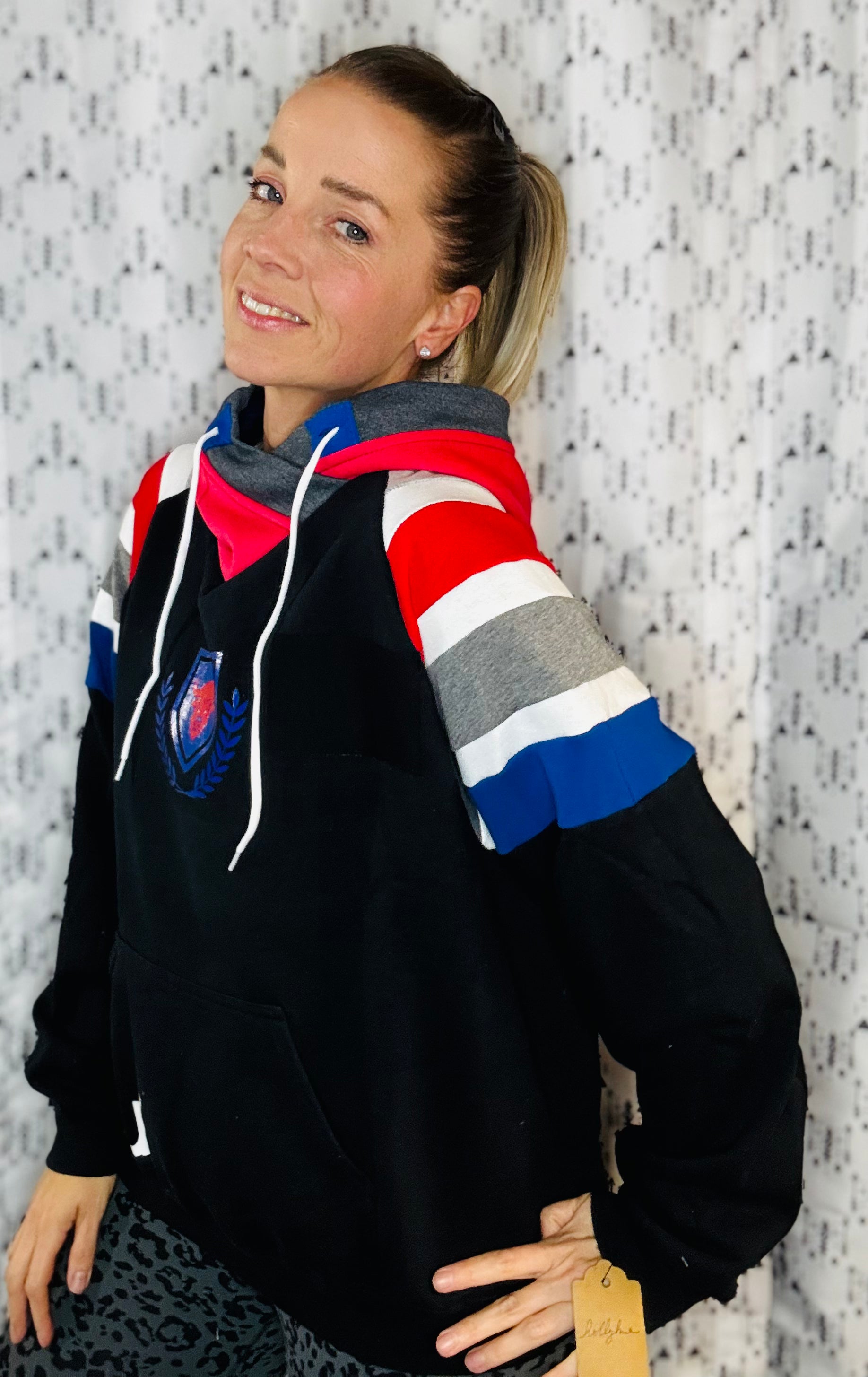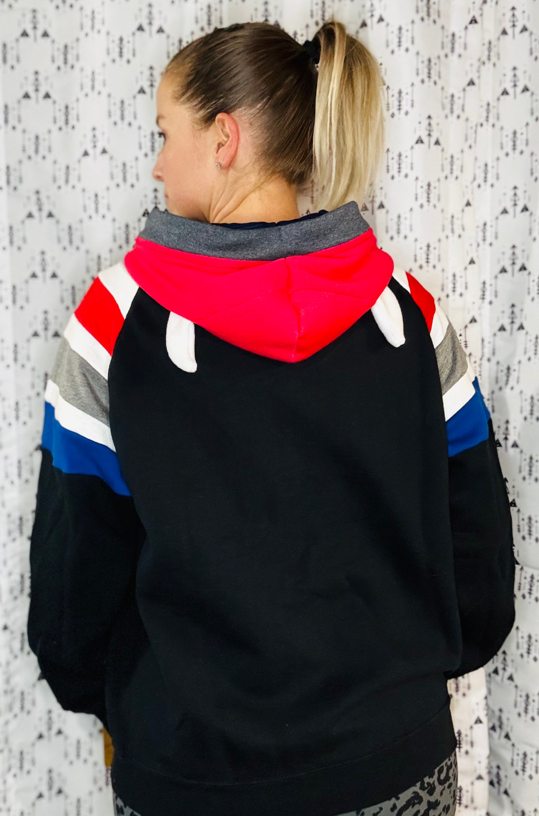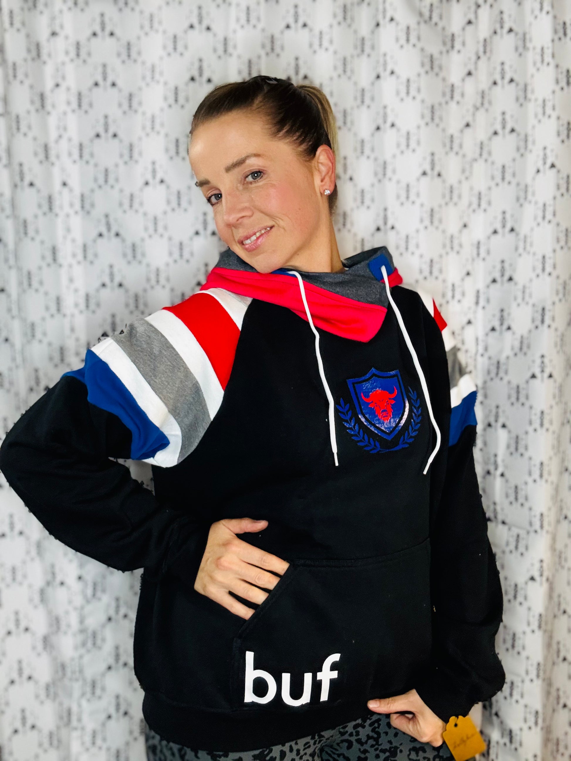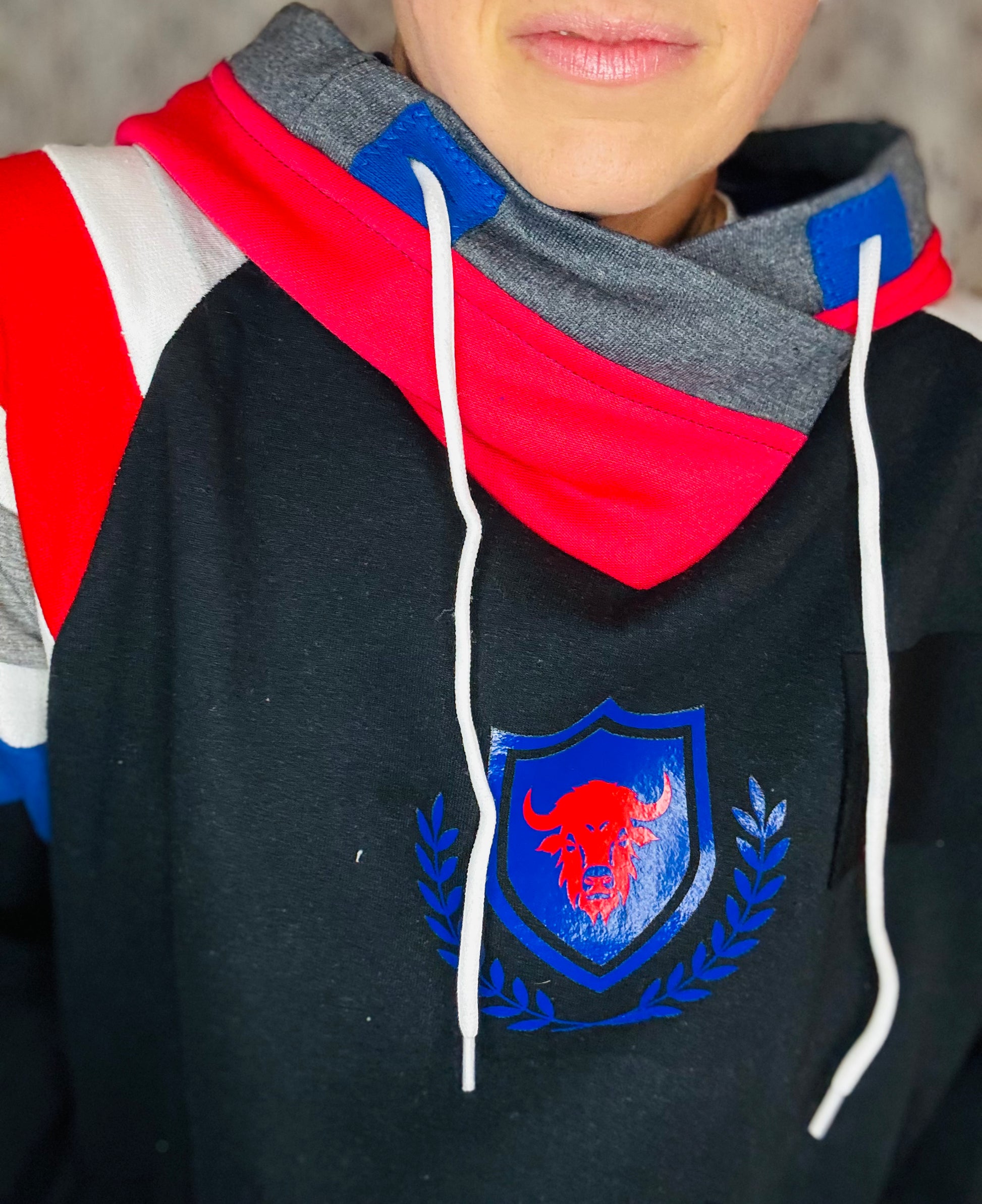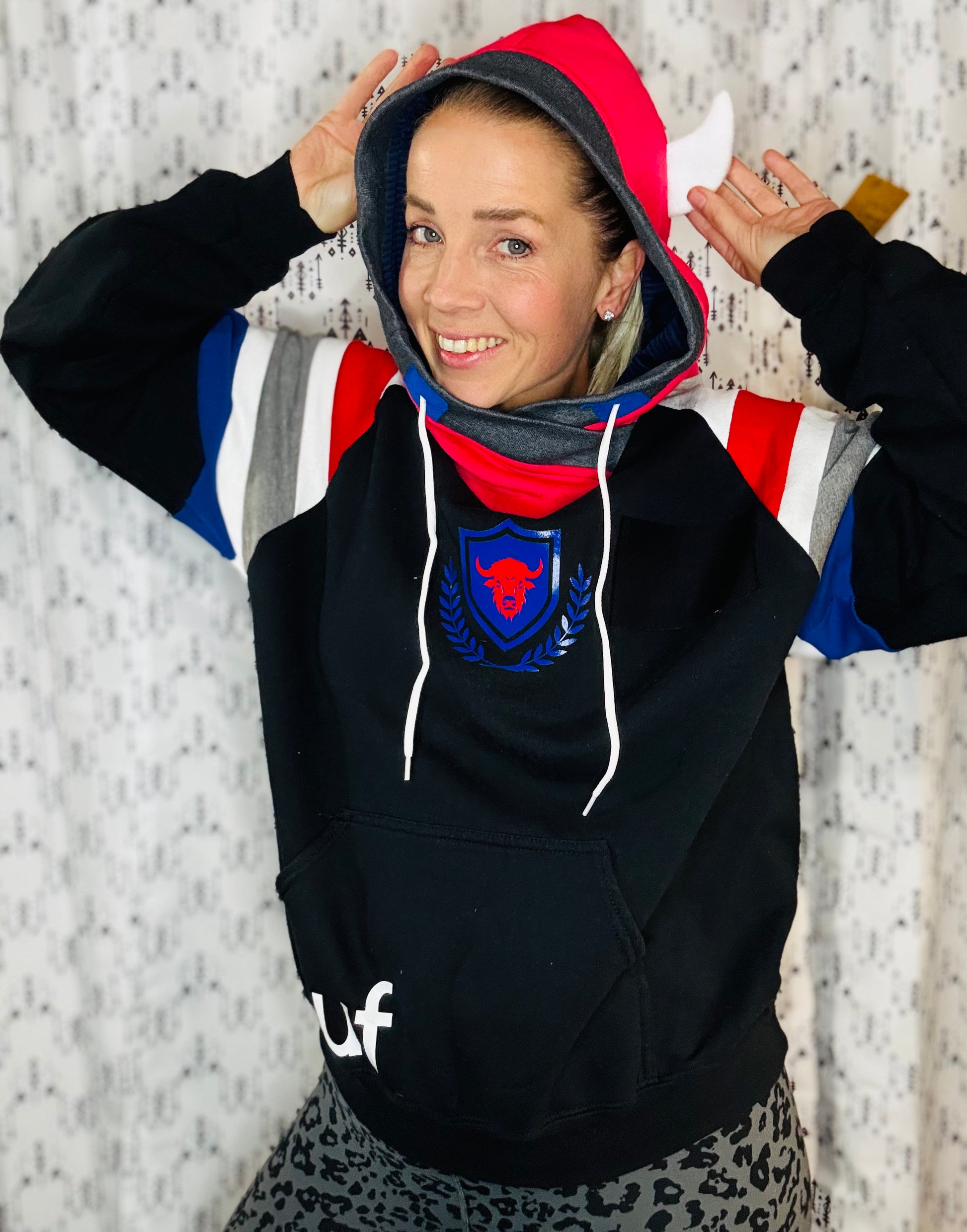 Black sweatshirt body with sewn stripes in sleeves and pocket. Buffalo horns in hood. Sewn and vinyl BUF appliqué on front.
