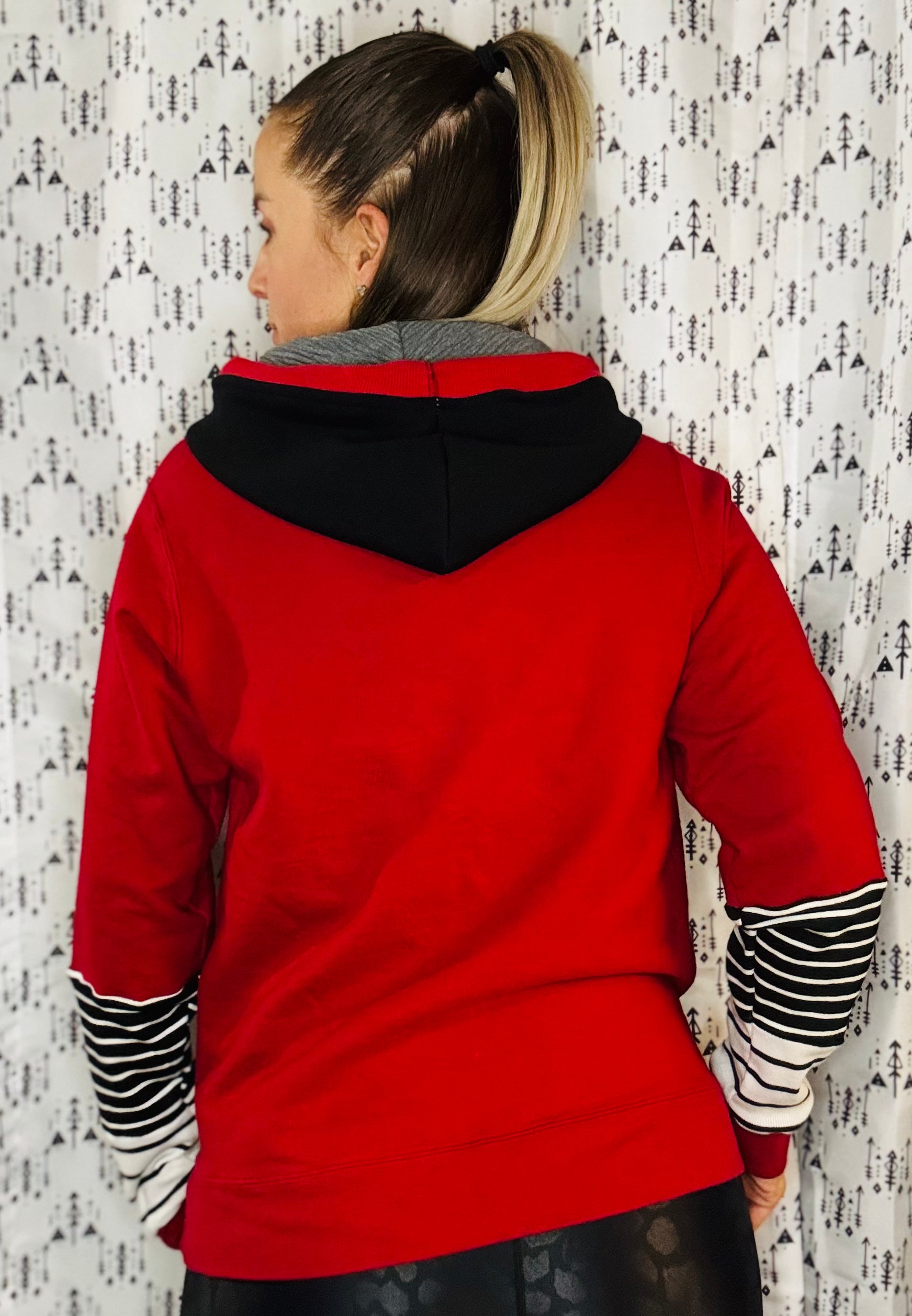 Red sweatshirt body with striped color-blocking in sleeves and black hood and chest. Vinyl appliqués' on front.