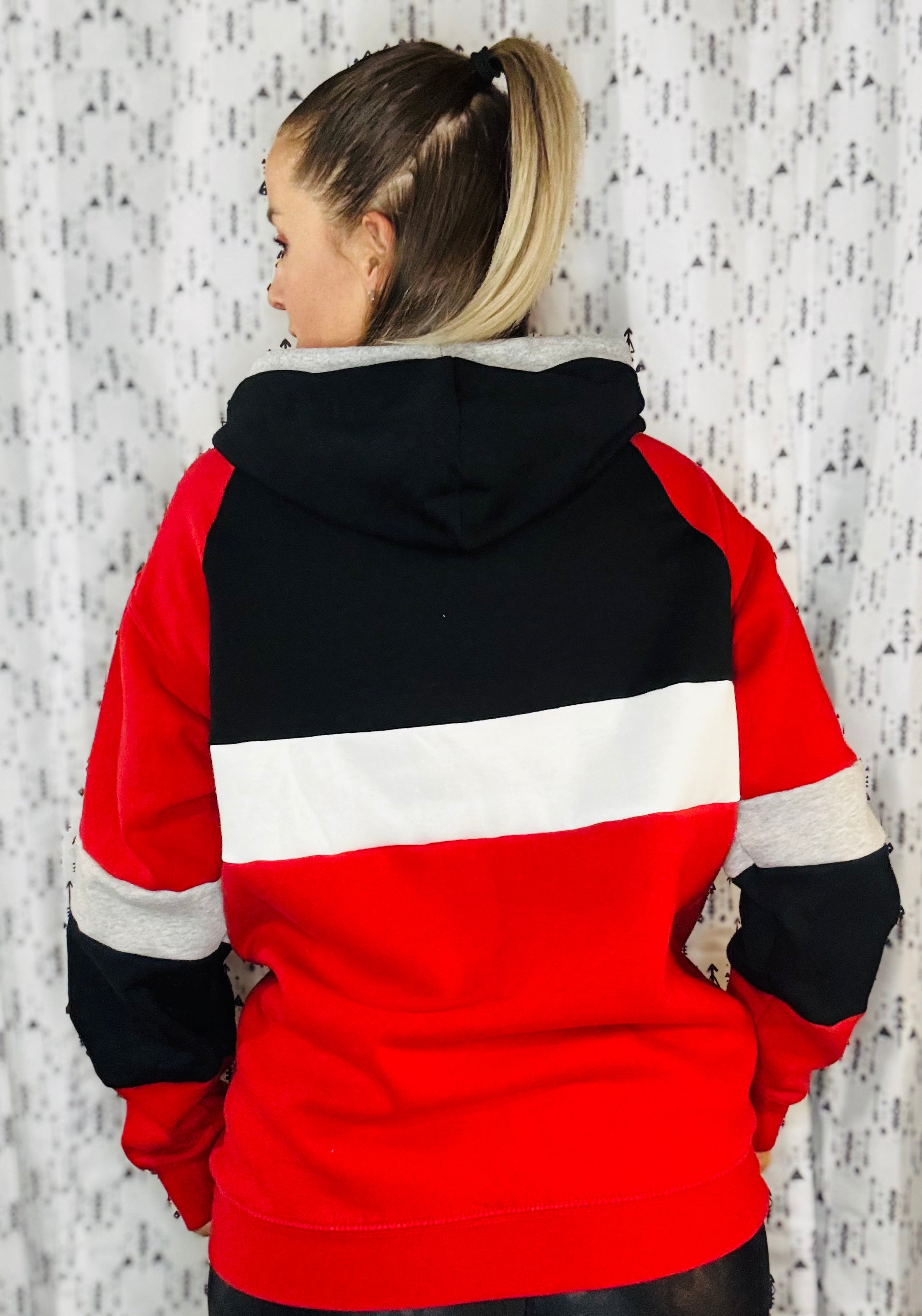 Red sweatshirt body with grey and black color-blocking in sleeves. Black hood and chest. Vinyl appliqués' on front.