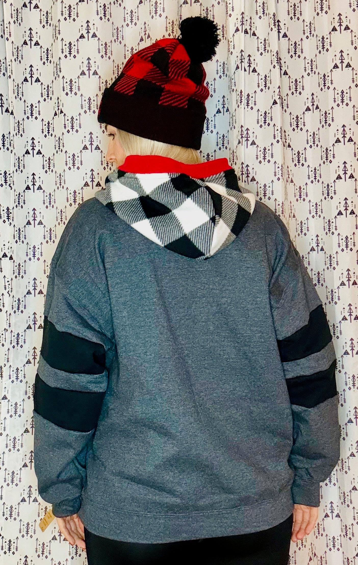 Charcoal grey sweatshirt body with fleece hood, flannel pocket and black stripe in sleeves. Sewn BUF plaid front.