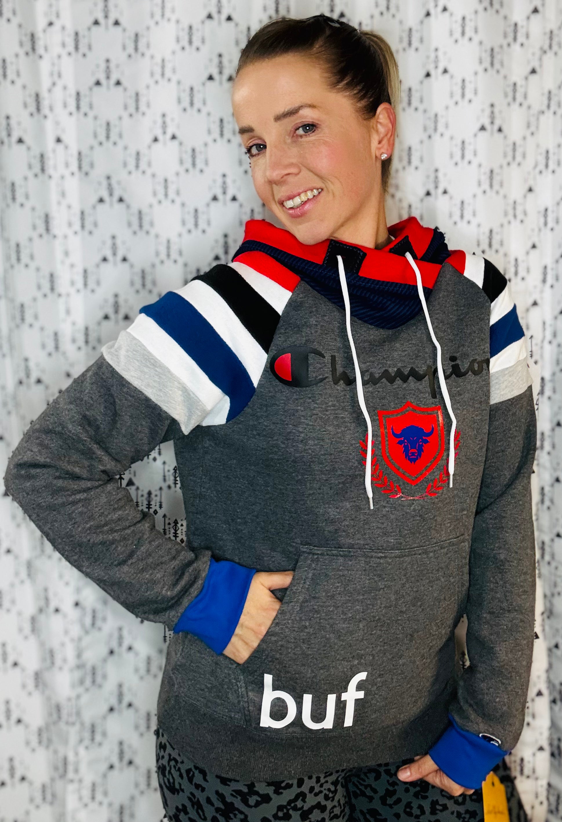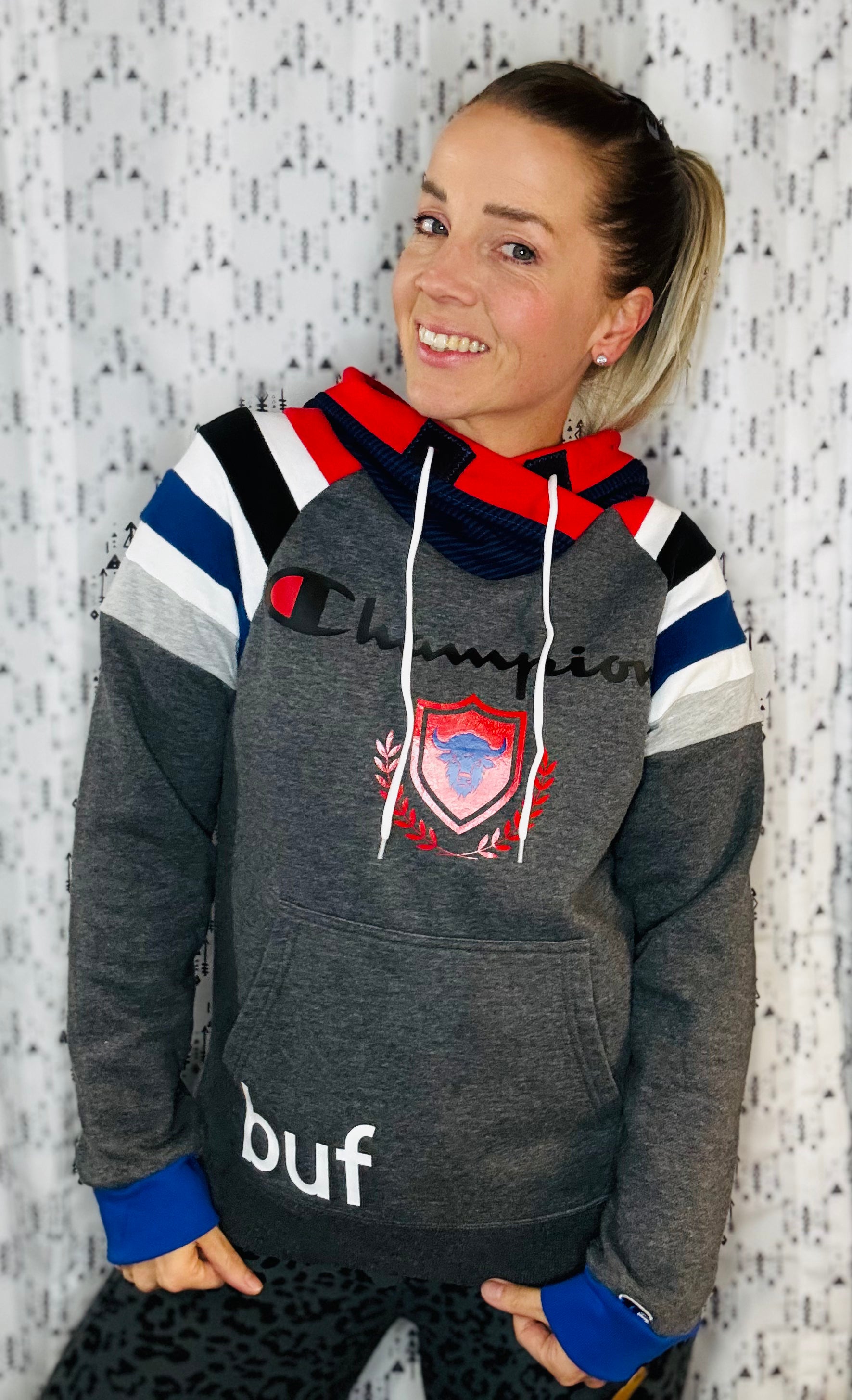 Dall grey re-worked champion sweatshirt body with sewn stripes in sleeves and pocket. Buffalo horns in hood. Sewn and vinyl BUF appliqué on front.