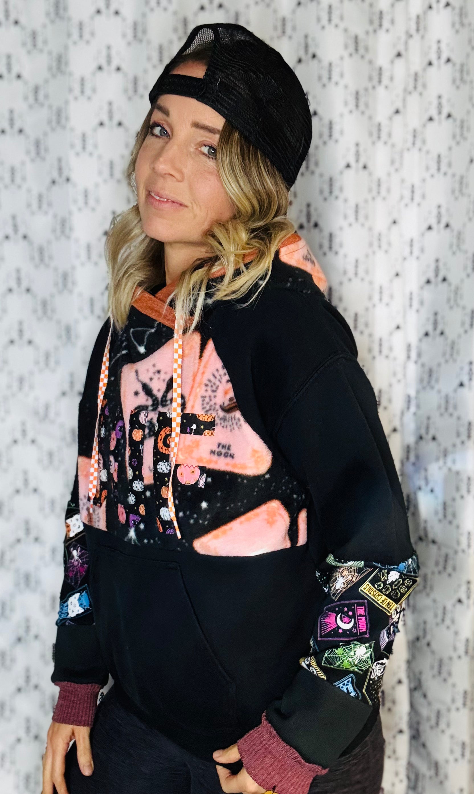 Black sweatshirt color-blocked anti-pill taro cards in chest and hood, with taro knot pattern in sleeves. Sewn BUF appliqués on front.