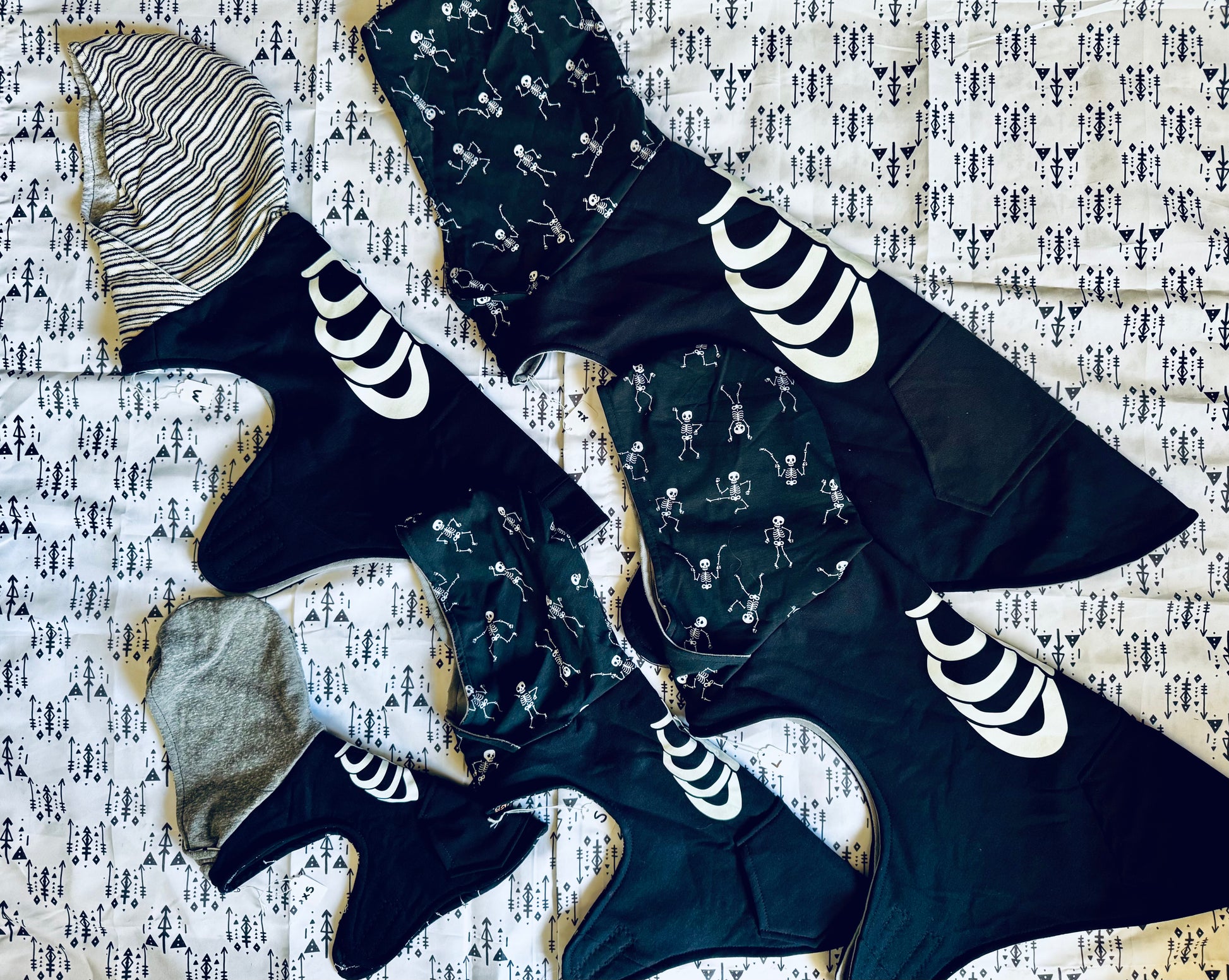 Skeleton dog hoodie with function pocket and hood. Velcro waist that can be tightened or expanded to better fit your pet!