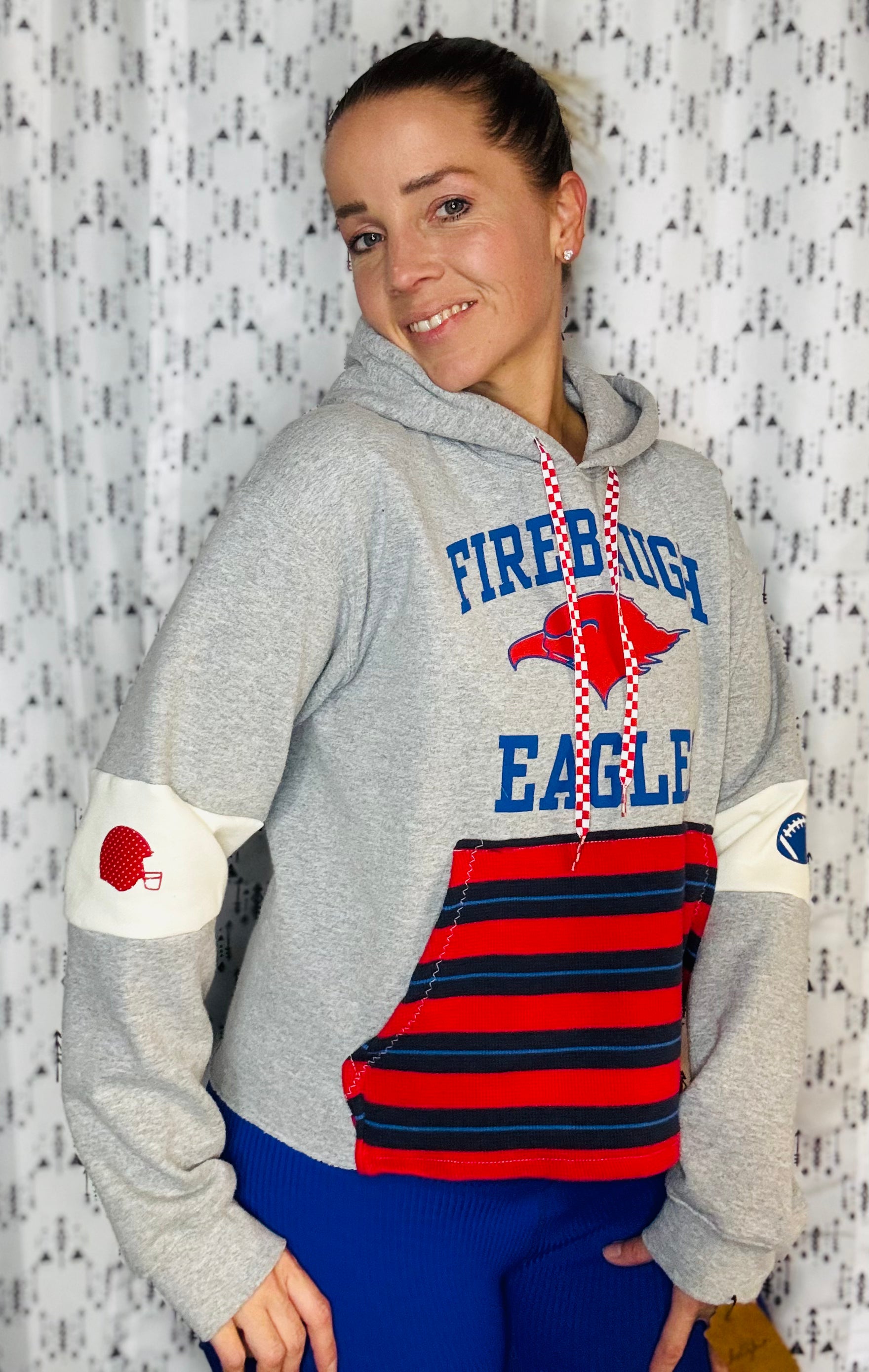 Heather grey sweatshirt body. Stripes in sleeves and striped pocket. Raw crop hem.