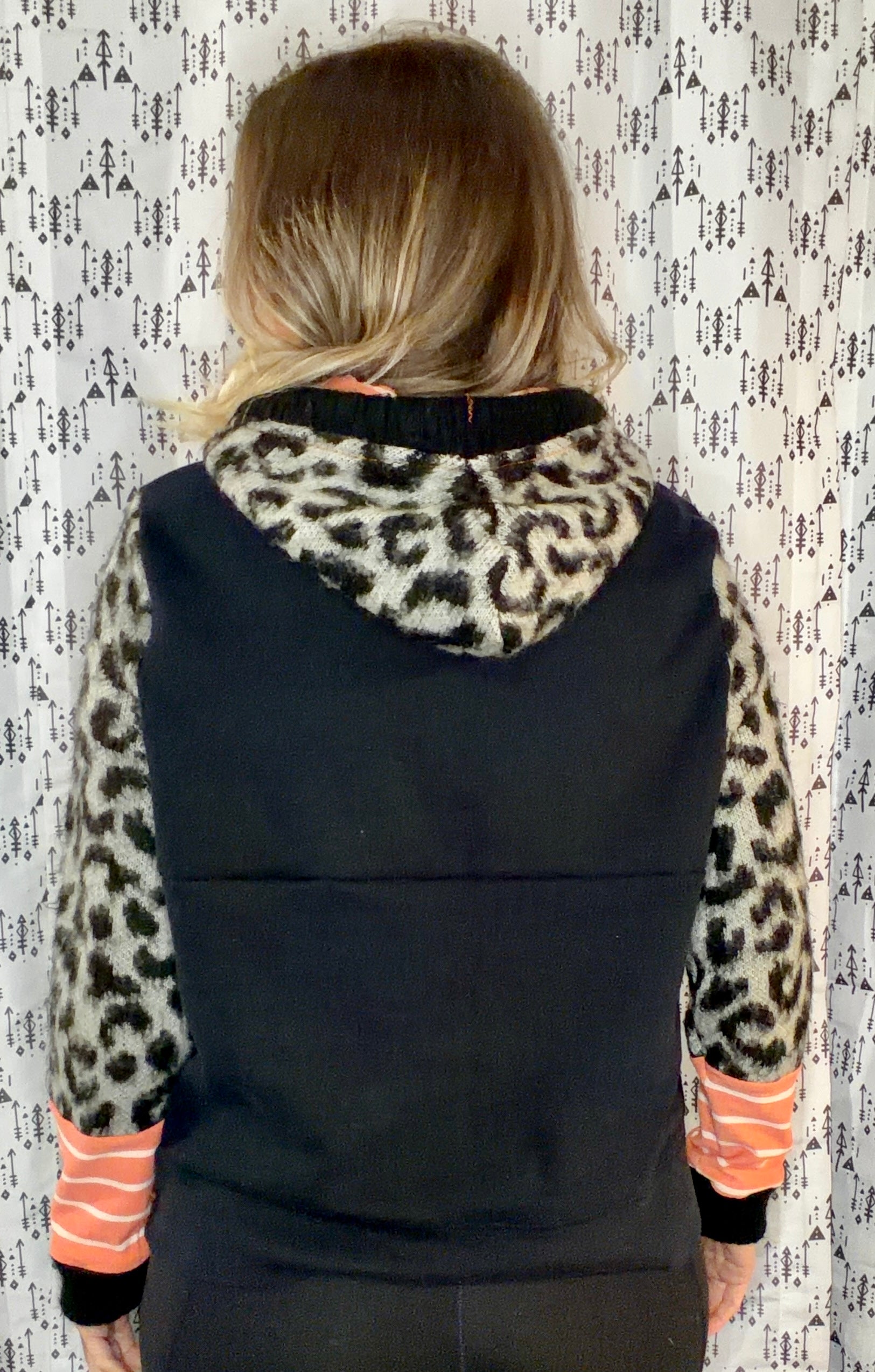 Black sweatshirt body with leopard sweater sleeves and matching hood. Black pocket, color-blocked sleeves with sewn and vinyl appliques' on front.