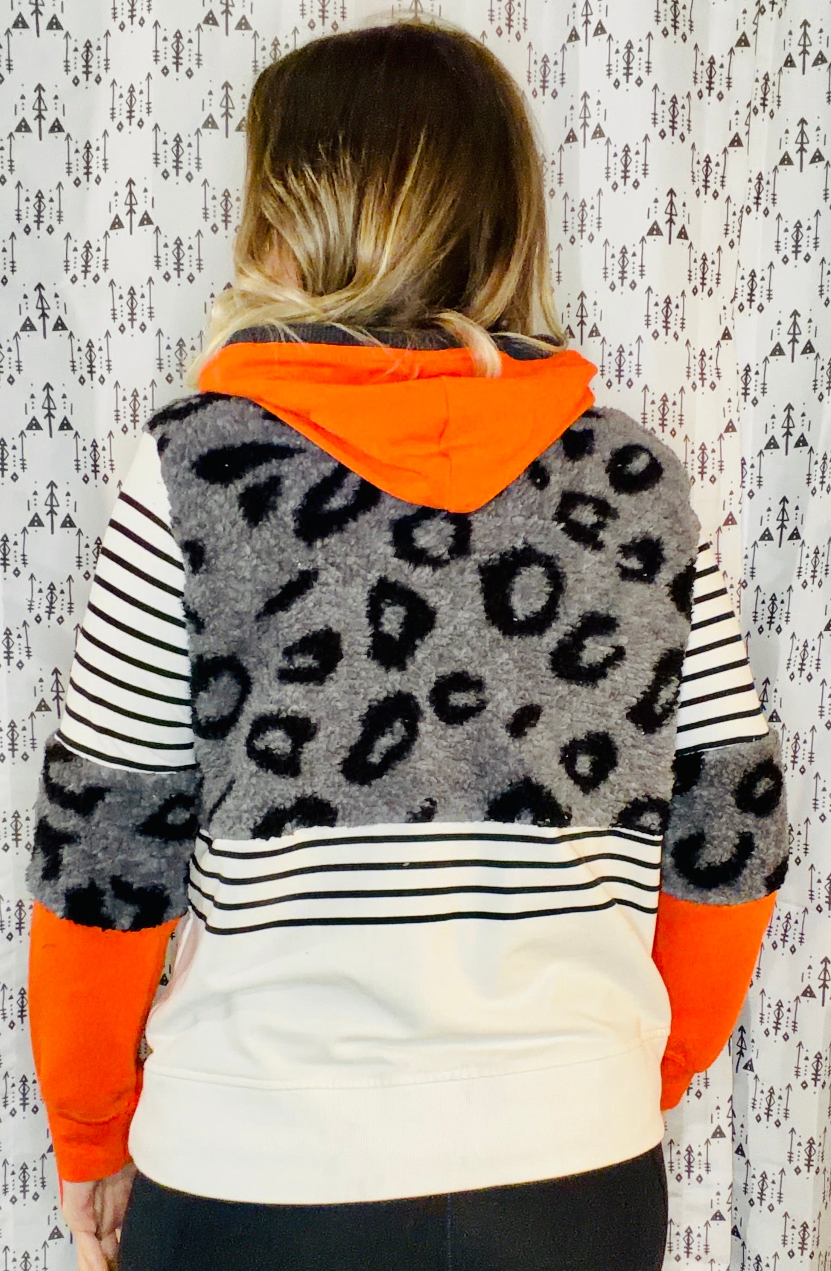 Fleece leopard body with striped knit and color-blocked sleeves. Orange hood, striped pocket. Sewn and vinyl appliques' on front.