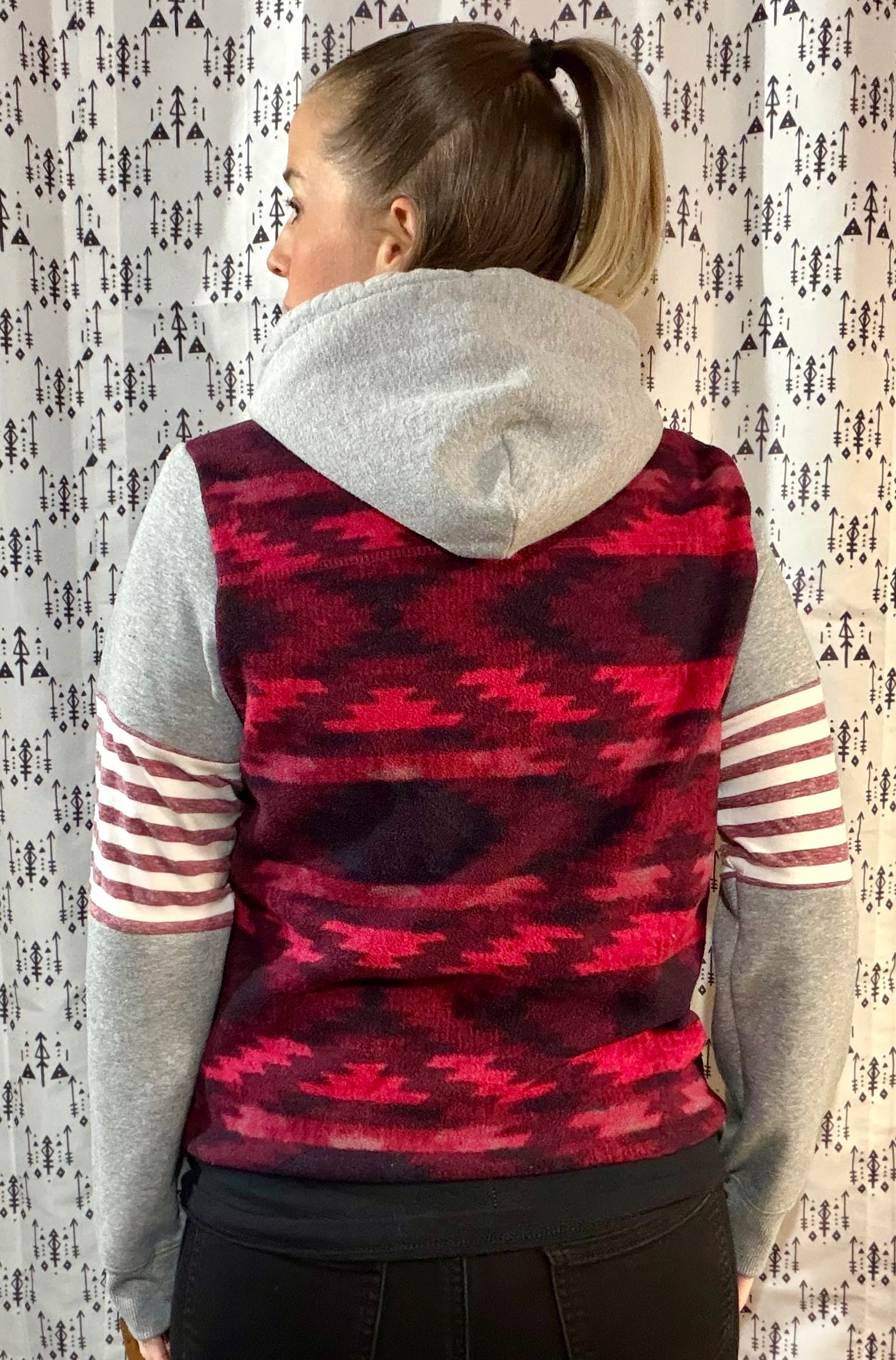 Red aztec body with striped pocket and sleeve inserts. Grey sleeves and matching hood. 1/4 zip. Sewn applique' on front.