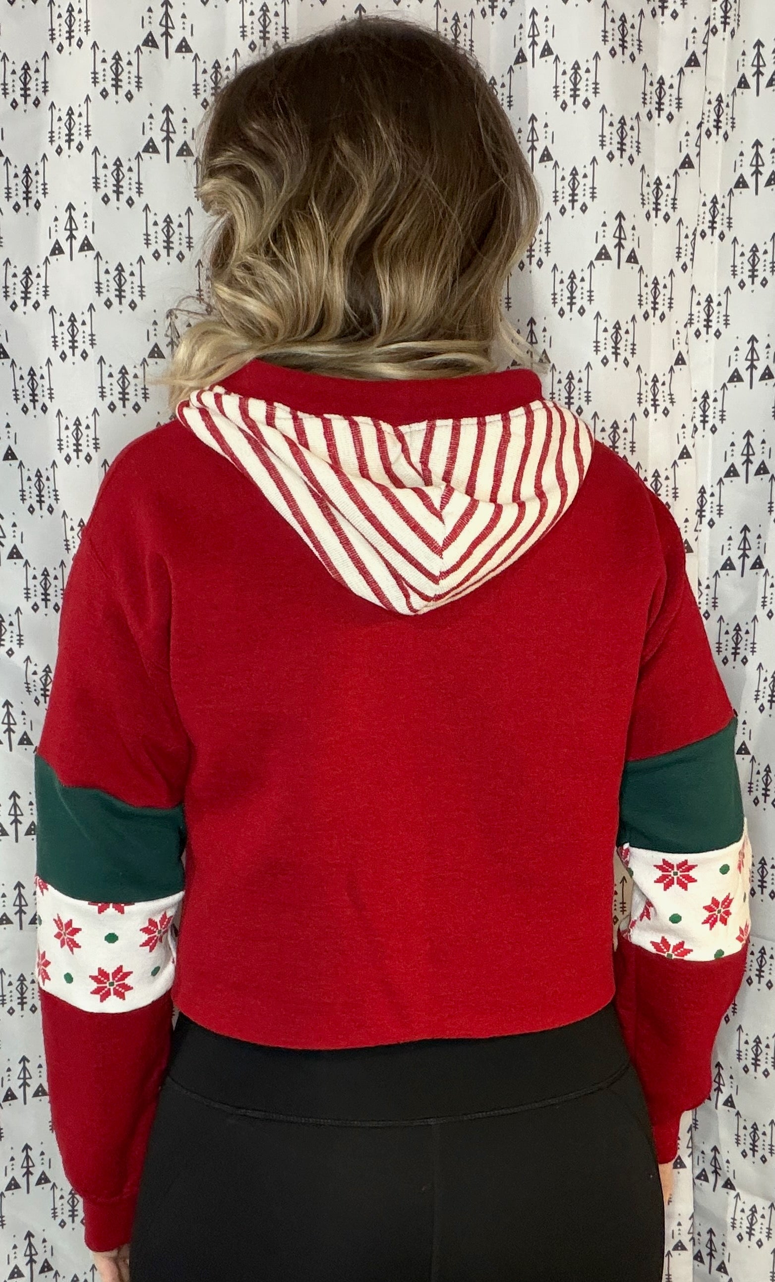 Red sweatshirt body with xmas print sleeves and striped hood. Sewn appliqués on front.