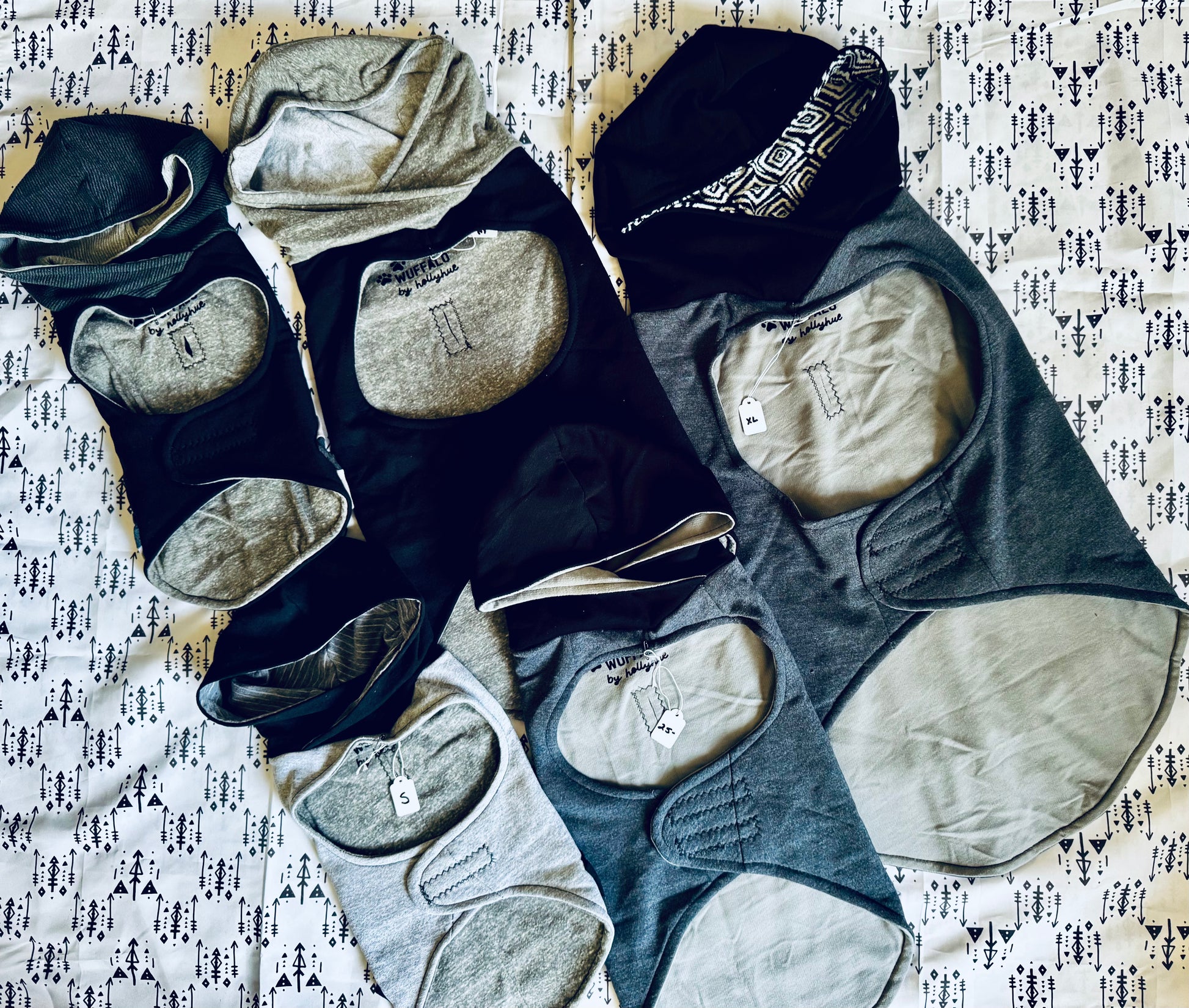 Grey with functional striped pocket and hood. Velcro waist that can be tightened or expanded to better fit your pet!
