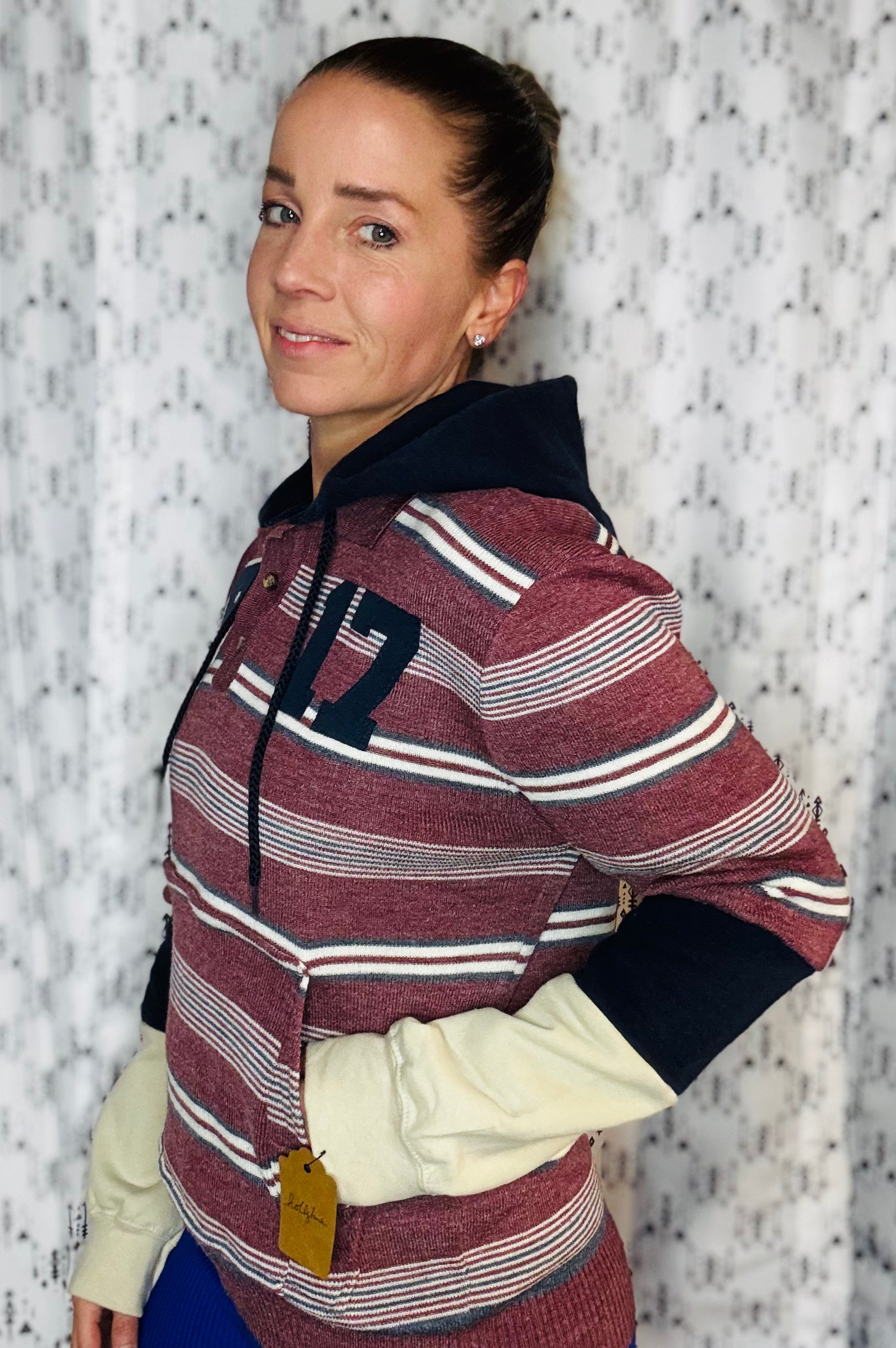 Vintage red striped button neck sweater body with color-block sleeves. Pocket, hood, sewn 17 patches on front, and back.